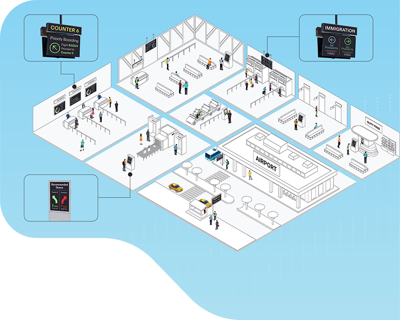 Elimine el estrés de esperar en las colas o en los puntos de servicio. Mantenga informados a los pasajeros con información en tiempo real sobre el flujo de pasajeros y el funcionamiento de la terminal.